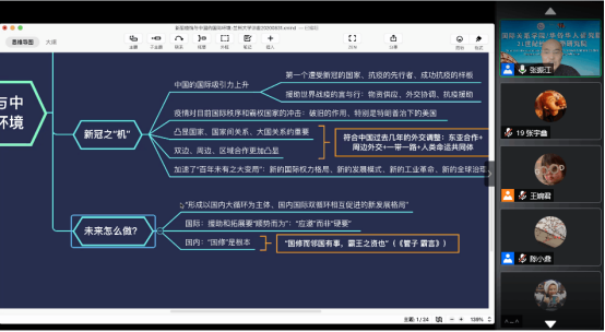 随后,张教授指出,新冠疫情危中有机。其一,由于我国在抗疫、防疫国际合作中的积极作为和突出贡献,中国的国际吸引力上升。其二,疫情对目前国际秩序和霸权国家带来了很大冲击。其三,疫情凸显了国家、国家间关系、大国关系的重要。其四,疫情使双边、周边、区域合作更加凸显。其五,新冠疫情带来新的国际权力格局、新的发展模式、新的工业革命、新的全球治理,加速了“百年未有之大变局”。