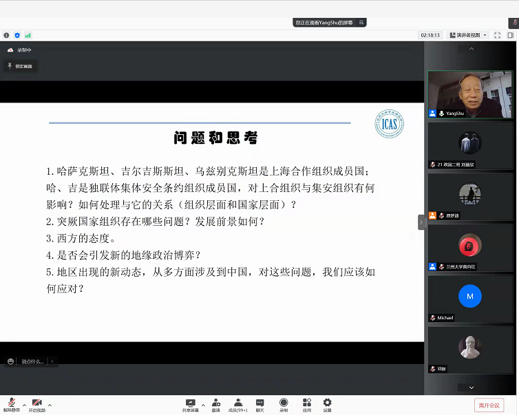 11月18日下午15:30,j9九游会登陆鹿鸣讲堂“政国”系列第38讲线上讲座顺利举行。应j9九游会登陆邀请,兰州大学中亚研究所所长杨恕教授为参会师生进行题为“土耳其与中亚”的学术讲座。本次讲座由我院曾向红教授和韦进深副教授主持。