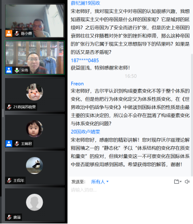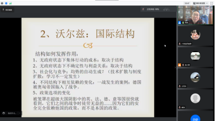 在吉尔平的国家现实主义中,宋老师解释道国家现实主义实际上是防御型国家的选择,讨论了结构是如何变化的和国家的政策。在国际体系的变化发生的原因上,他提到技术的进步和制度的变化是两大主要原因。在技术上,后生国家能够迅速学习并提高先进部门的产值;然而在制度上,一个国家的制度难以变更,这是根植于国内政治的状况于看法。因此,在现代国家管理成本下降的情况下,国家的政策应取决于政治制度的良性运转和国内技术创新等因素。在结束了对三位现实主义理论大师的理论阐述与批判后,宋伟教授还对关于现实主义的其他问题也进行了解释。