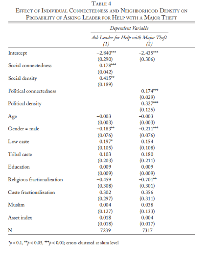 个人网络位置和社区网络密度都与警察接触的意愿(例如,向他们报告失窃状况的意愿)、贿赂警察的预期成本以及对警察的总体满意度有关。同时发现,这些结果并不是更网络化的社区经历更少冲突的结果,而是这些社区更有可能在与警察互动时依赖政治调解人。作者的最后一项发现强调了政治调解在世界上许多穷人与国家正式机构互动方面的重要作用。