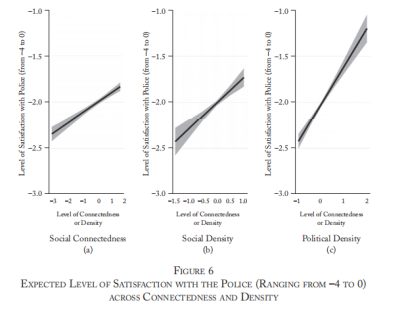 社会联系密集的贫民窟和个人可能比社会联系分散的贫民窟和个人,有更多更好的非正式手段来解决内部争端和治安问题(而不转向求助警察)。较少频繁地接触警察可能会提升民众对警察的满意度。社会联系密集的公民或贫民窟可能能够更好地利用贫民窟领导人的影响力进行与警察互动。