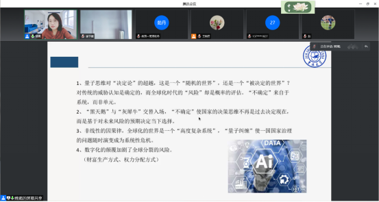 姚璐教授指出,全球化的“不确定”由于复杂系统和多元主体的大量互动等原因愈发凸显,黑天鹅和白犀牛不断发生,我们应该意识到不确定性给今天的全球治理带来了巨大的挑战,同时也需要思考在不确定性背景下,全球治理该何去何从。一般观点认为,国家,这一过去全球化的首要推动者,今天正成为冲击影响这一系统的主要力量,因此全球治理未来的发展可能面临着去国家化,即加强非国家主体的作用,姚璐教授提出,国家在全球治理中的作用仍然无法替代,去中心化才是应对挑战的基本途径,这一转变既意味着全球治理仍然被需要,但应该实现变革,同时国家也重新调整其在全球治理过程中的角色定位,国家需要提升韧性,增强其在不确定性背景下的抗风险能力,并完成非中心化条件下国家应该在全球治理中需要完成的任务。今天,全球治理的实践受到挑战,但也在发展变化,同学们应该在观察变化的同时跟进研究。最后,姚老师针对同学们提出的问题做出了解答。