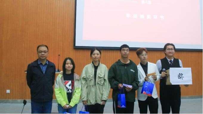 大会第三项,播放新生投稿最美家乡展图片视频集锦,并进行抽奖活动,这一环节将本次大会推向高潮。在大会开始前,每位新生的位置上都被放上了一封由高年级学长学姐们亲笔书写的新生寄语,以及一张任意颜色的纸条,在大会上的抽奖环节上,由学院党委书记常虹老师与院长汪金国教授在纸箱共同抽取带有颜色的纸条,与放置于新生信封中的纸条相对应,纸条颜色一致的同学即为获奖,并由学院副院长陈小鼎教授为四位获奖同学颁发学院精美礼品一份。
