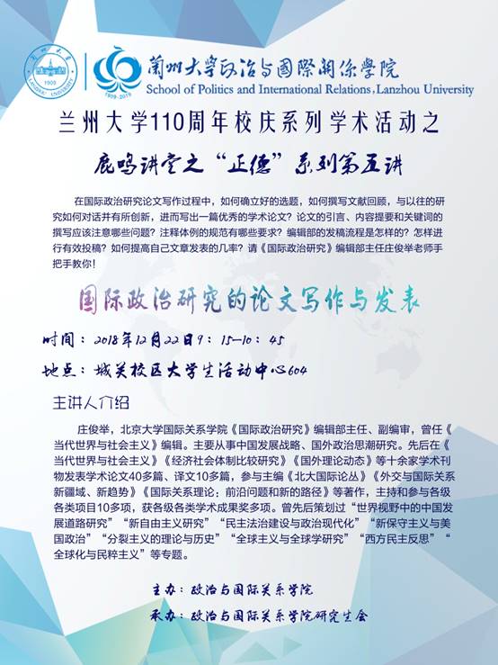应j9九游会登陆邀请,北京大学国际关系学院《国际政治研究》编辑部主任、副编审庄俊举老师于2018年12月22日来我院进行学术交流并作讲座,欢迎广大师生届时参加。