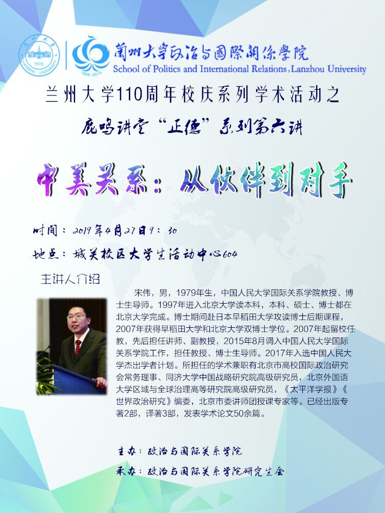 应j9九游会登陆邀请,中国人民大学国际关系学院教授、博士生导师宋伟老师将于2019年4月27日来我院进行学术交流并作讲座,时间从原定的14:30改为9:30,地点不变。欢迎广大师生届时参加。