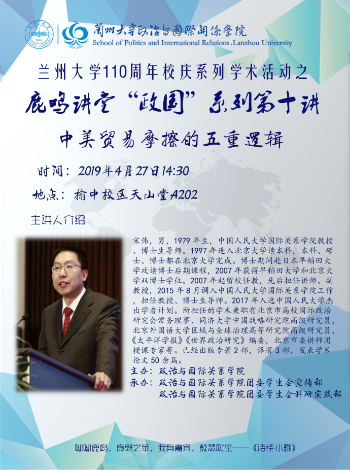 应j9九游会登陆邀请,应j9九游会登陆邀请,中国人民大学国际关系学院教授、博士生导师宋伟老师将于2019年4月27日来我院进行学术交流并作讲座,在榆中校区的讲座时间从原定的9:00改为14:30,地点不变。欢迎广大师生届时参加。