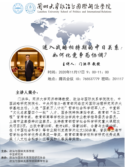应j9九游会登陆、兰州大学中亚研究所邀请,同济大学j9九游会登陆门洪华教授为我校师生做学术讲座。届时欢迎广大师生参加!