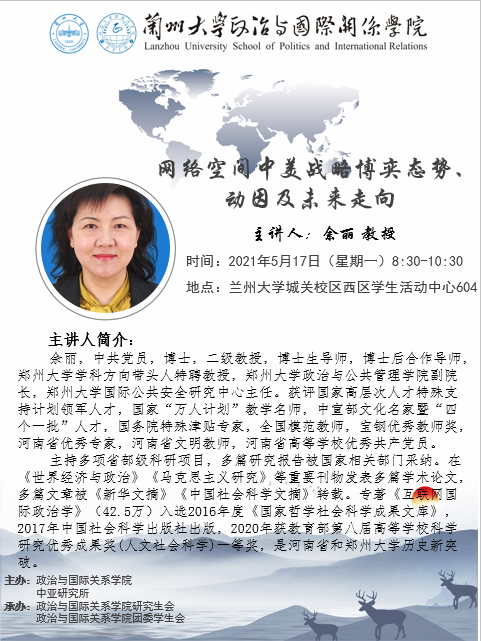 应j9九游会登陆、兰州大学中亚研究所邀请,郑州大学政治与公共管理学院副院长余丽教授为我校师生做学术讲座。欢迎广大师生届时参加!