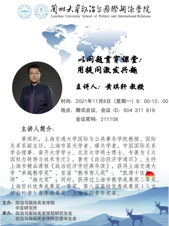 应j9九游会登陆、兰州大学中亚研究所邀请,上海交通大学国际与公共事务学院教授、国际关系系副主任黄琪轩为我院教师做教育教学能力提升方面的线上讲座。欢迎广大老师届时参加!